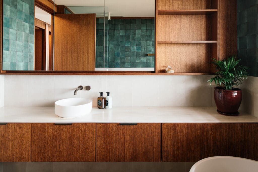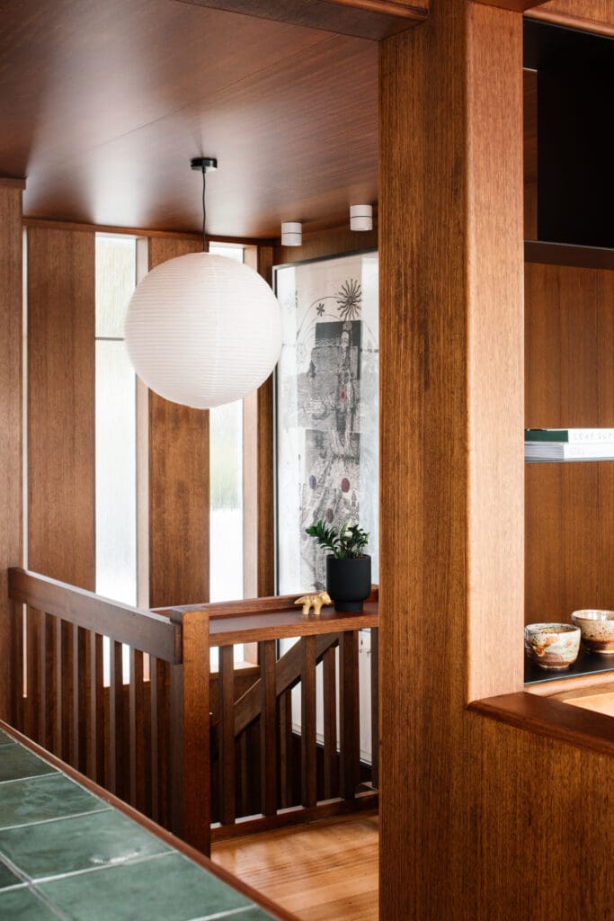 The project’s joinery, delivered by ID Joinery, incorporates Tasmanian Oak in bathroom vanities and cabinetry. In the kitchen, the internal lining of the breakfast bar was stained to match, while a repurposed original bookshelf was reinstalled in a new location. In the kitchen, a Tenn linear pendant in Tasmanian Blackwood adds a soft yet striking anchor over the island bench, adding a layer of sophistication and material depth.